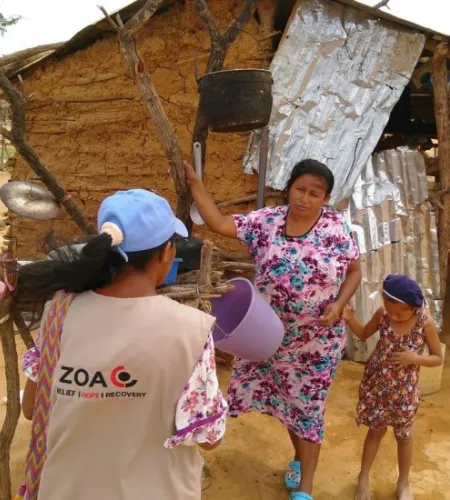 Genoeg redenen voor ZOA om een noodhulpactie op te zetten in het noorden van Colombia, in de provincie La Guajira, een gebied waar veel Venezolanen heenvluchten. ZOA richt zich op de meest kwetsbare mensen die geen inkomen of bezittingen meer hebben. Zij wonen in de illegale nederzettingen, in zelfgebouwde onderkomens, die meestal niet al te veilig zijn. In deze informele kampen verbetert ZOA de water- en sanitaire voorzieningen. We delen afsluitbare watertanks en waterfilters uit. Ook bouwen we latrines en verbeteren we de hygiëne en toevoer van drinkwater bij de gaarkeukens, waar mensen uren moeten wachten op eten. Door de hygiëne te verbeteren, moet de uitbraak van ziektes voorkomen worden. In totaal helpt ZOA met dit project in de informele kampen bijna 3700 mensen.
